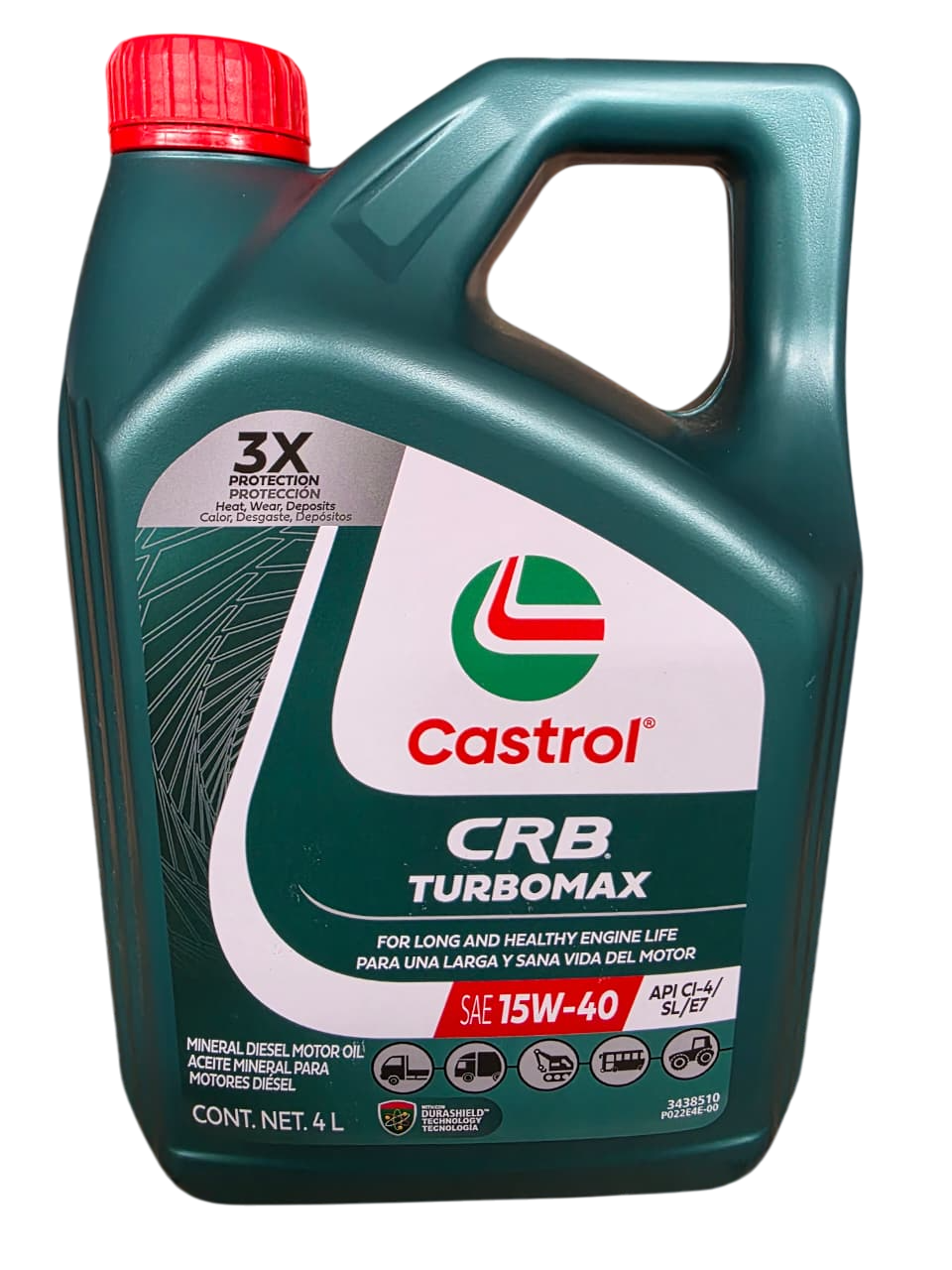 Castrol CRB Turbomax 15W40 CI-4/SL/E7 con DuraShield BoostersTM es un aceite para motor diesel avanzado para servicio pesado destinado a motores diesel de alta especificación que cumplan con los requisitos de emisiones de Euro I a Euro V. Es apto para motores sin filtros de partículas, algunos motores con recirculación de gases de escape (Exhaust Gas Recirculatioin, EGR) y algunos motores dotados con sistemas de reducción tecnología de reducción catalítica selectiva (Selective Catalytic Reduction, SCR).
