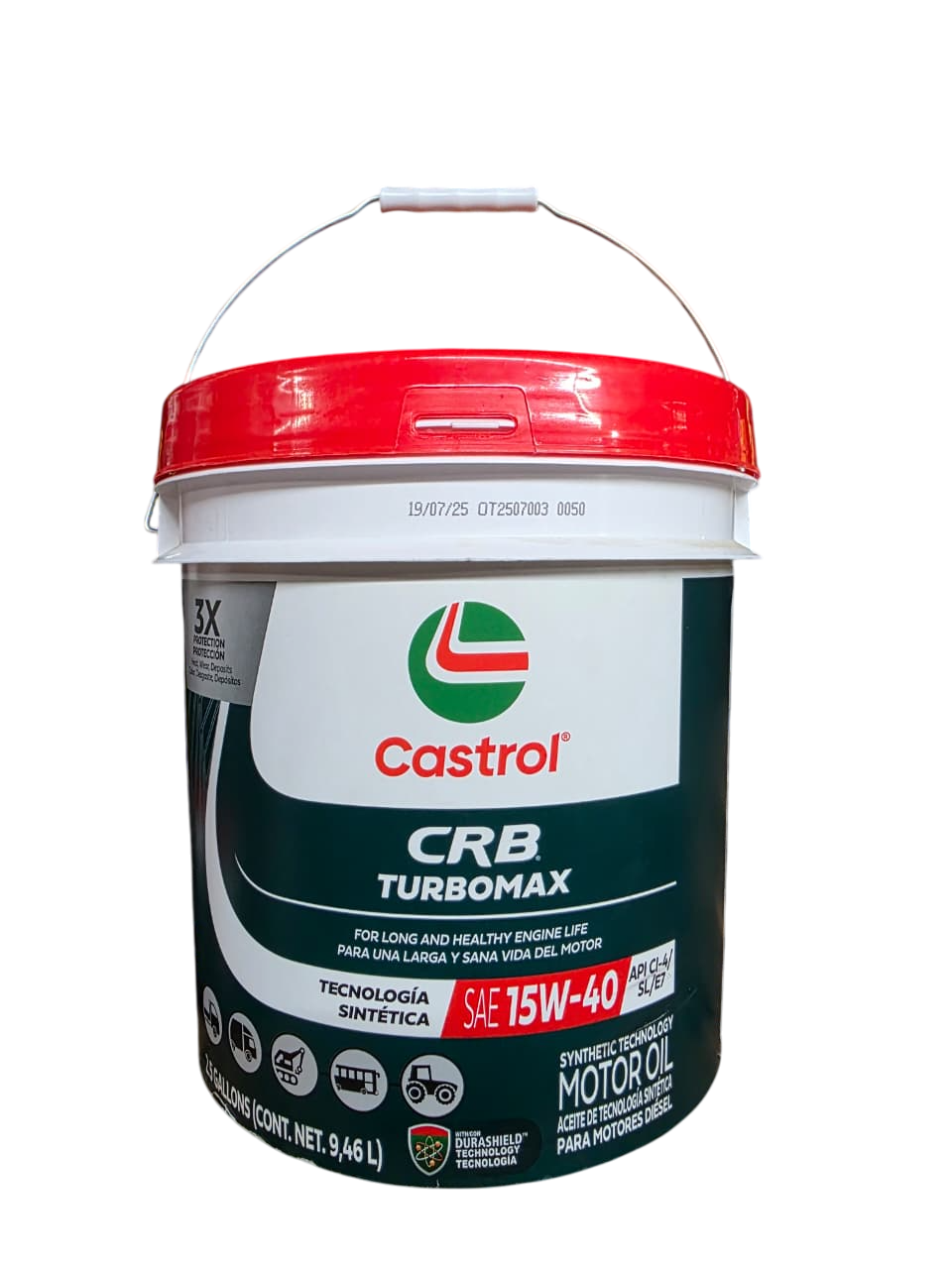 Castrol CRB Turbomax 15W40 CI-4/SL/E7 con DuraShield BoostersTM es un aceite para motor diesel avanzado para servicio pesado destinado a motores diesel de alta especificación que cumplan con los requisitos de emisiones de Euro I a Euro V. Es apto para motores sin filtros de partículas, algunos motores con recirculación de gases de escape (Exhaust Gas Recirculatioin, EGR) y algunos motores dotados con sistemas de reducción tecnología de reducción catalítica selectiva (Selective Catalytic Reduction, SCR).